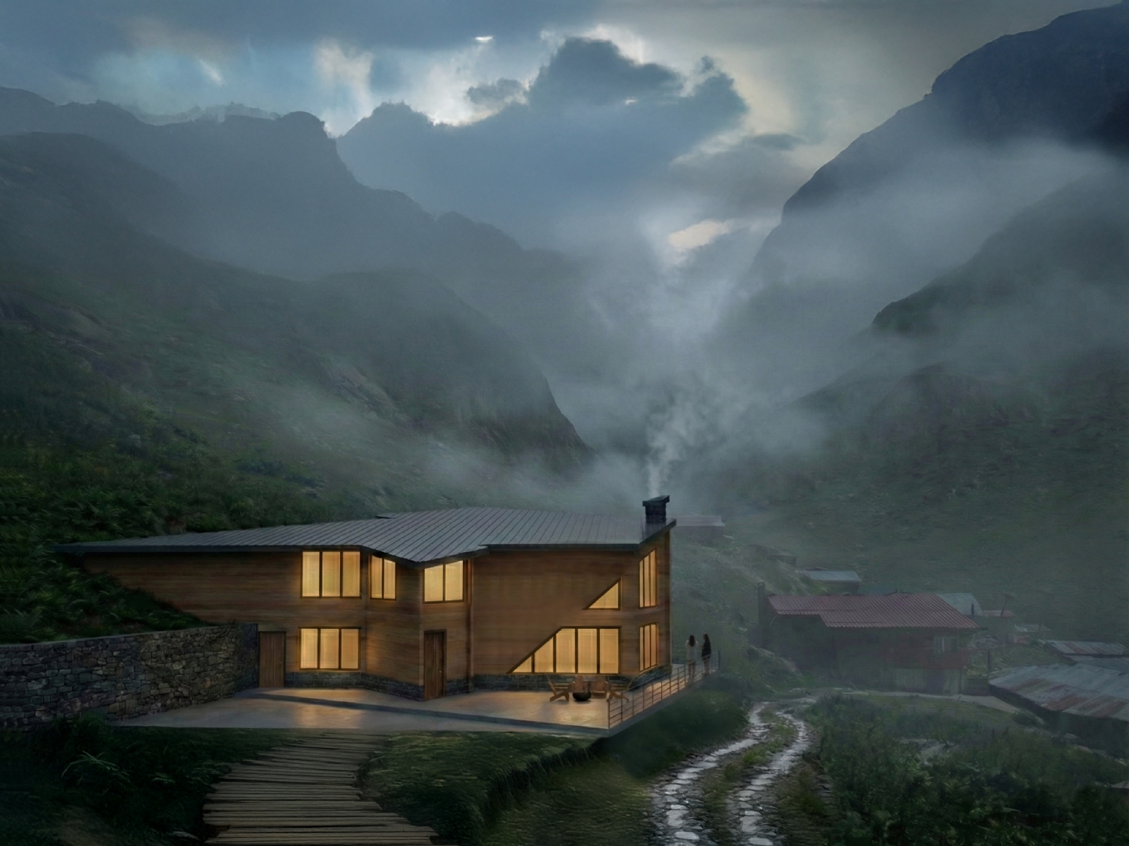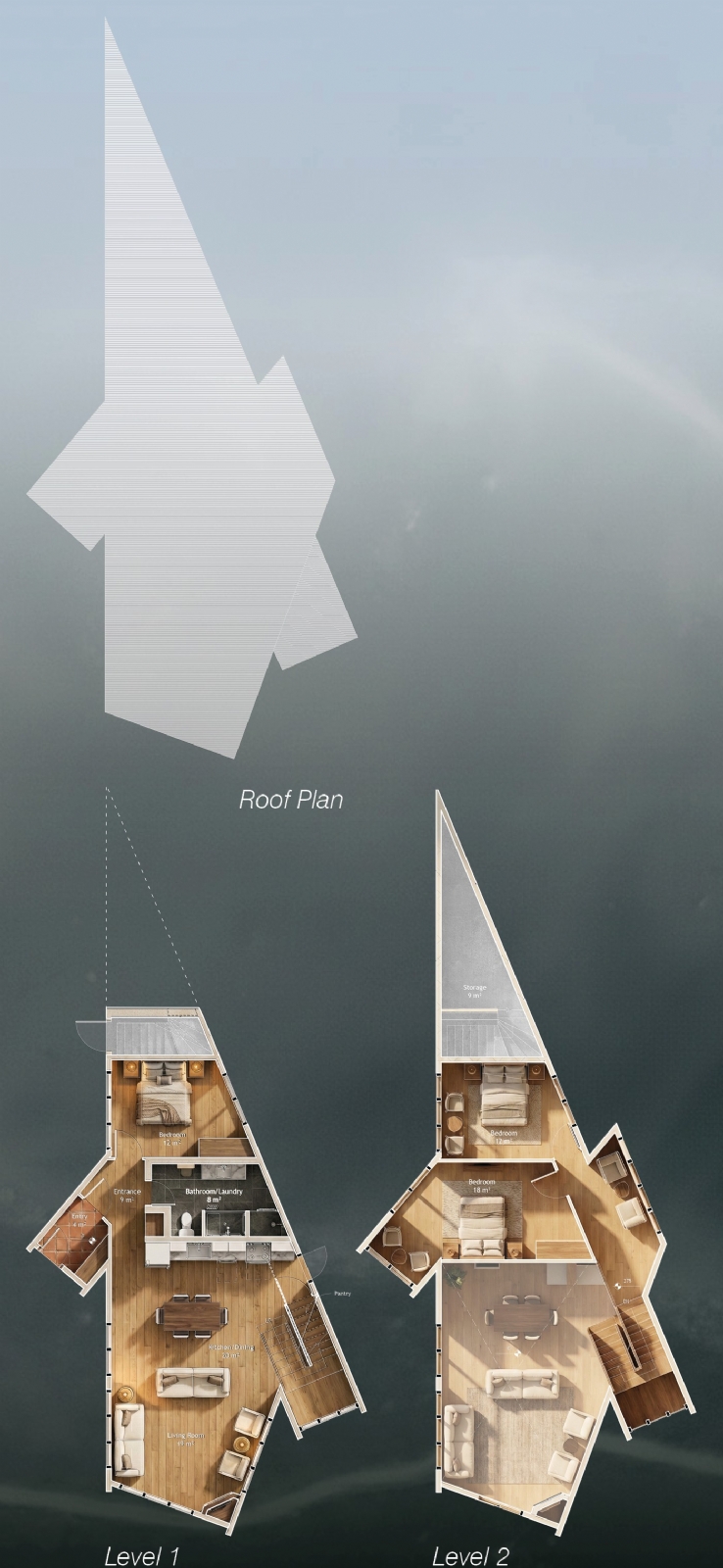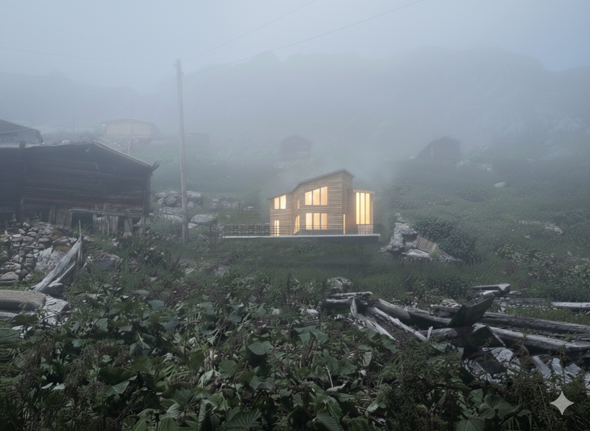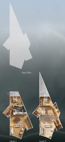 The architectural massing is organized through three channels that direct the building toward the sunrise and panoramic views. Material choices reinterpret local and traditional construction references through a contemporary palette of white surfaces, natural wood, and stone. Large vertical windows and generous terraces strengthen the relationship between interior spaces and the surrounding landscape.