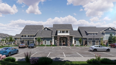 A comprehensive amenity program supports daily life and social interaction, anchored by a central clubhouse with a swimming pool, complemented by a mail room, dog car wash, and summer kitchen within landscaped outdoor spaces. The site plan carefully organizes buildings to define streets, courtyards, and pedestrian paths while ensuring clear vehicular circulation and accessible parking.