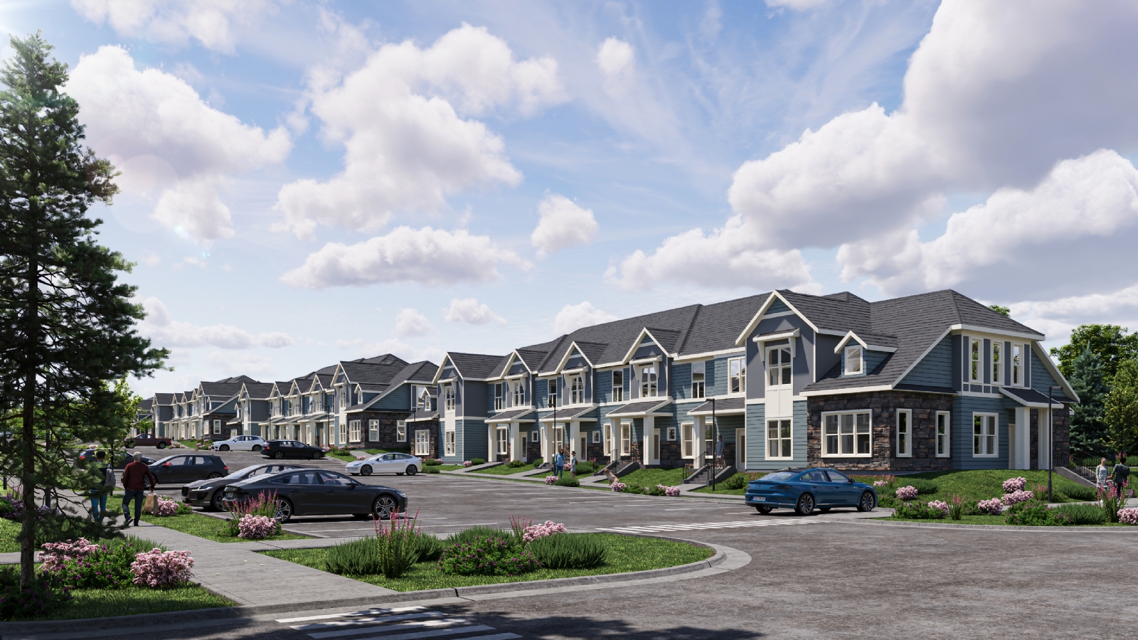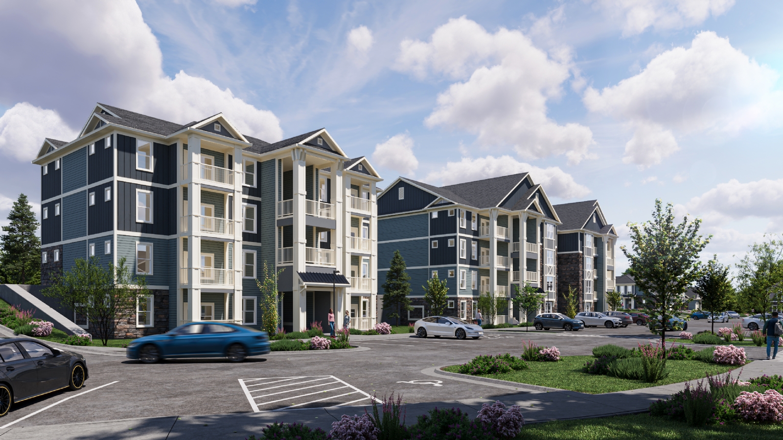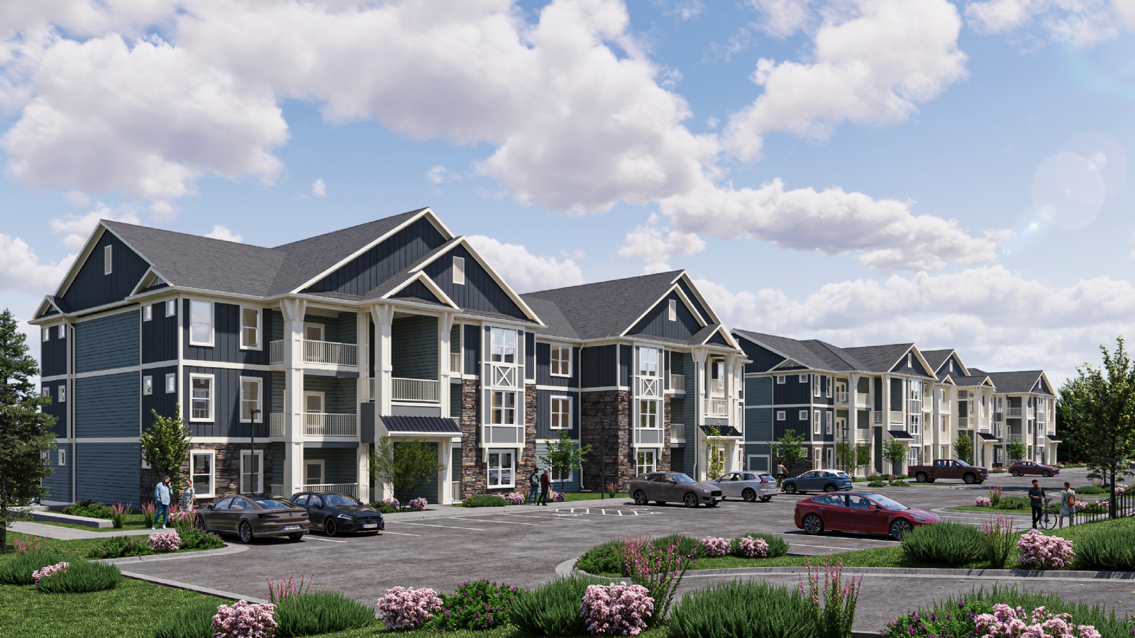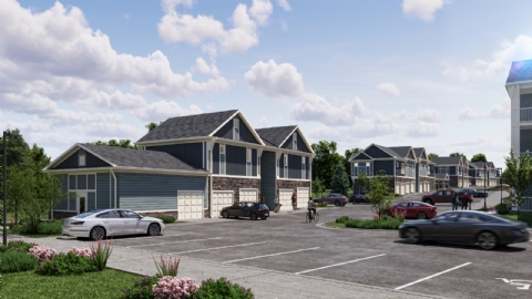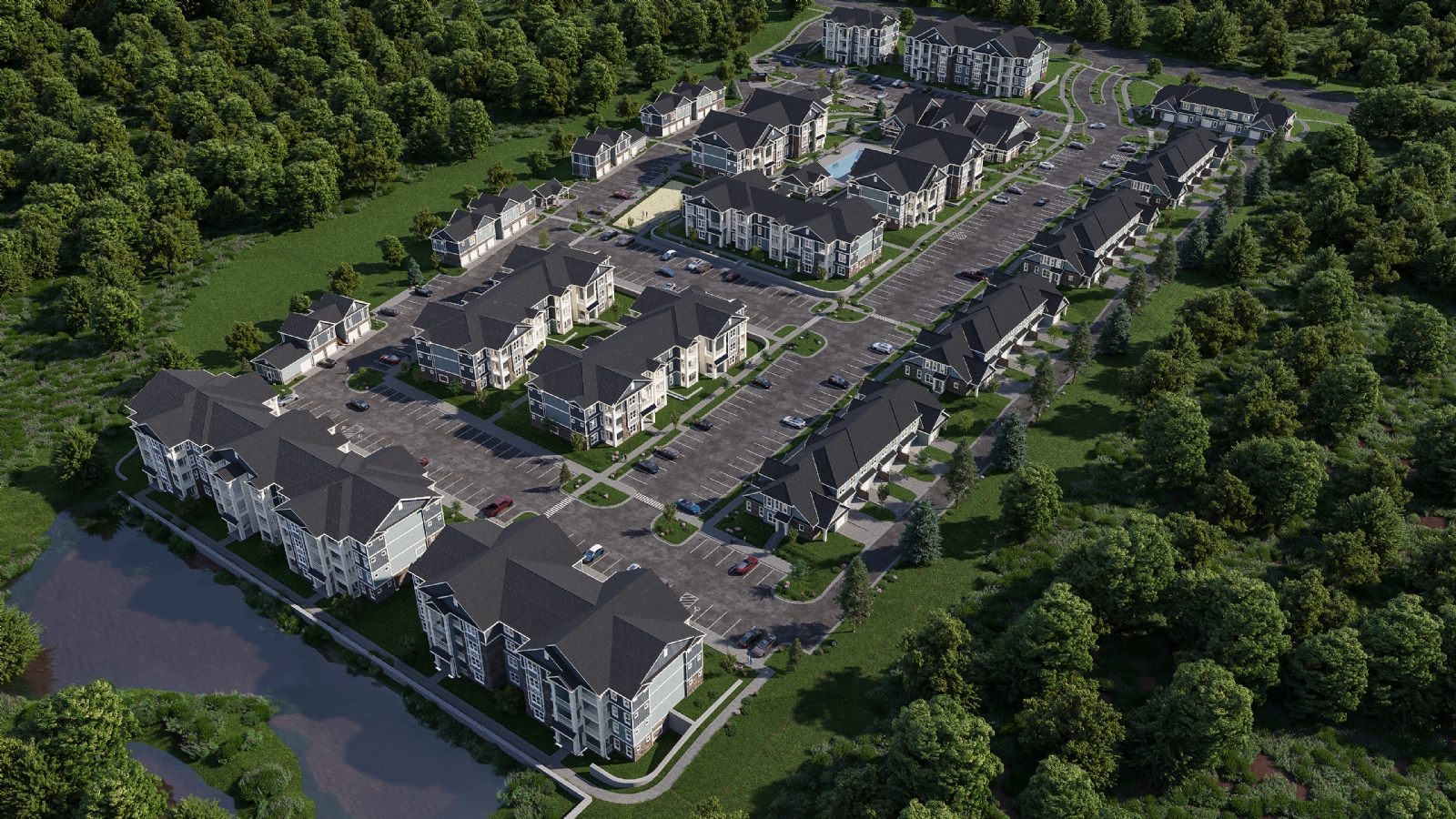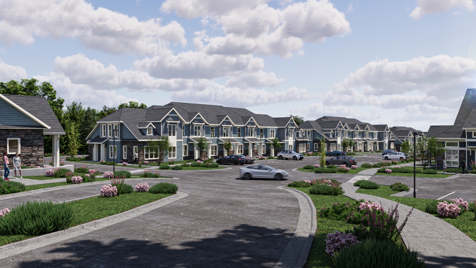 Kannapolis is a large-scale residential development envisioned as a diverse and well-connected community. The master plan integrates multiple residential typologies, including nine walk-up apartment buildings, five townhouses, four carriage houses, and a senior apartment building, forming a cohesive neighborhood structure.