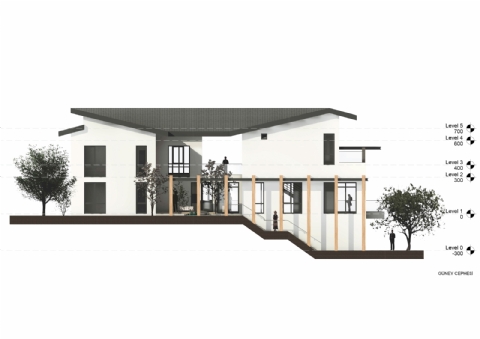 The plan organization is clearly defined across levels. The ground floor accommodates the main living spaces, including an open-plan living, dining, and kitchen area that extends toward the landscape. Upper levels are reserved for private functions, where bedrooms are positioned to ensure privacy while maintaining visual continuity with the surroundings. The sectional design allows the building to adapt naturally to the sloped terrain, creating a balanced relationship between architecture and topography.