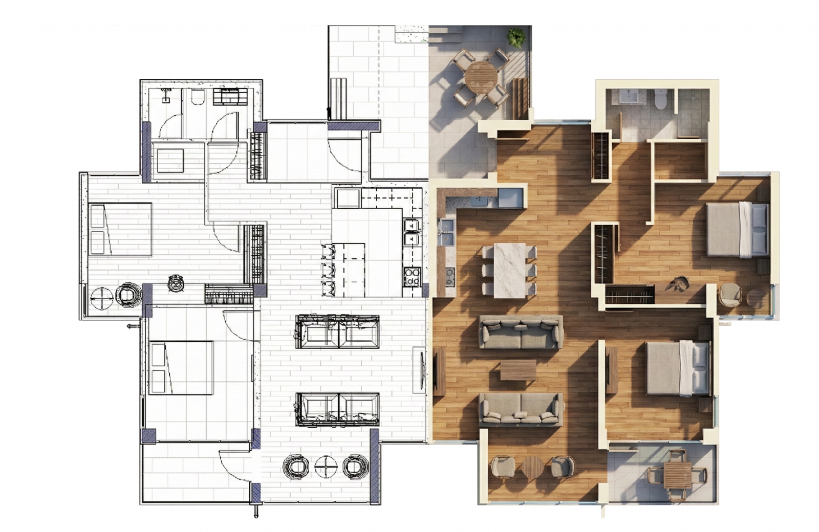The building is organized as three independent residential units. One apartment is located on the ground floor with direct access to outdoor spaces, while two separate apartments are positioned on the upper floor. Each unit is planned independently, ensuring privacy, functional clarity, and comfortable living conditions.