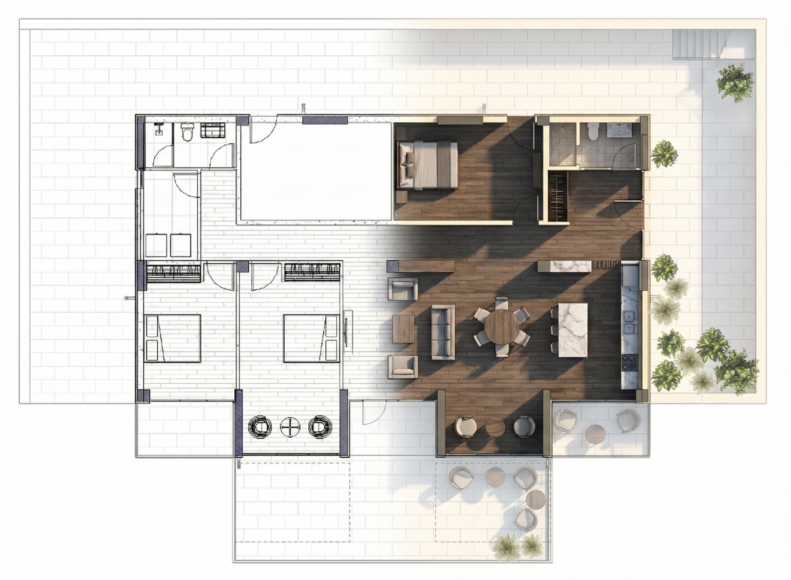 Designed for an open and airy setting, this residential project adopts a transparent and light-filled architectural approach. Large openings and clean modern lines maximize natural daylight and strengthen the relationship between interior spaces and the surrounding landscape.